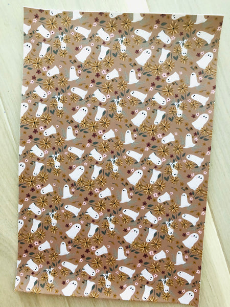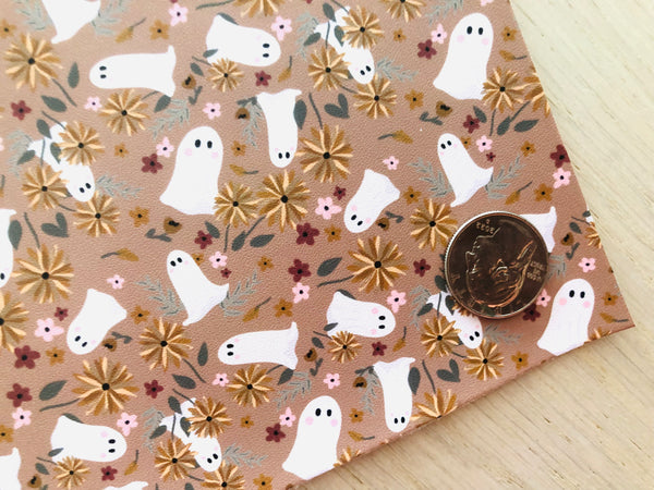 Custom printed smooth faux leather with a ghost and floral design.
