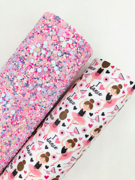 Custom printed smooth faux leather with a ballerina and floral design.
