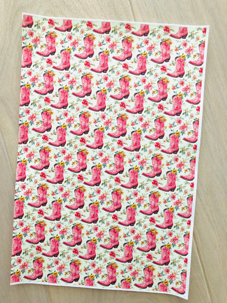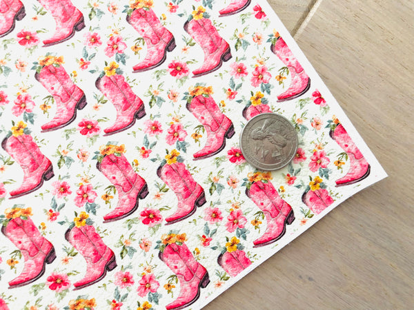 Printed pebbled faux leather with a cowboy boots and floral design.