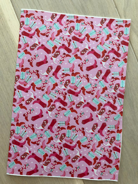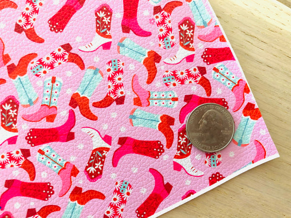 Printed pebbled faux leather with a cowboy boots and floral design.