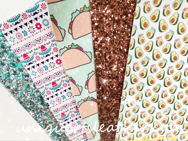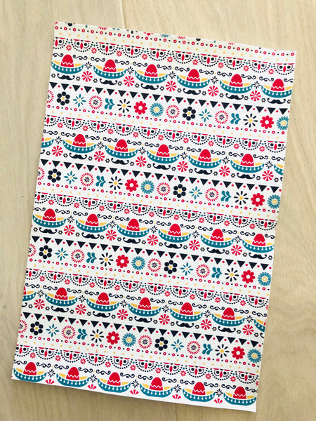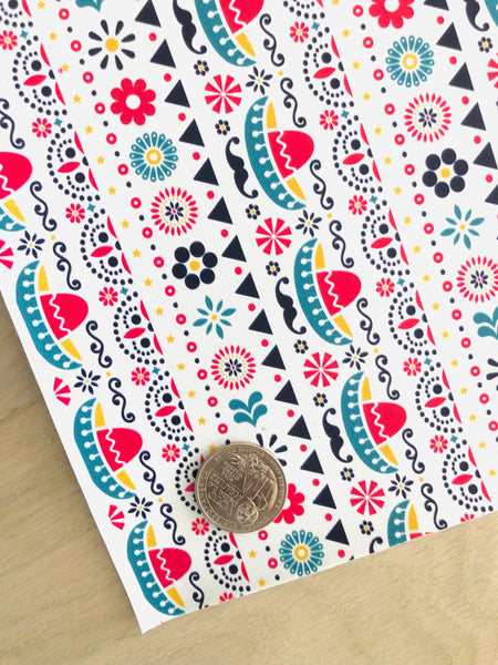 Custom printed smooth faux leather with a sombrero and mustache design.