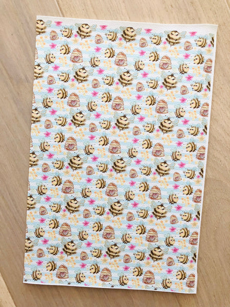 Printed pebbled faux leather with a bee design.