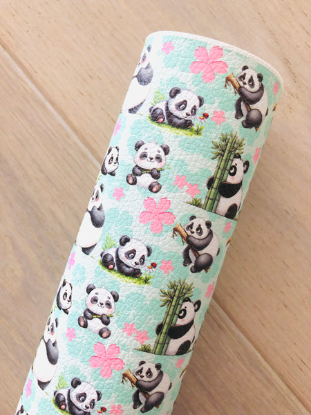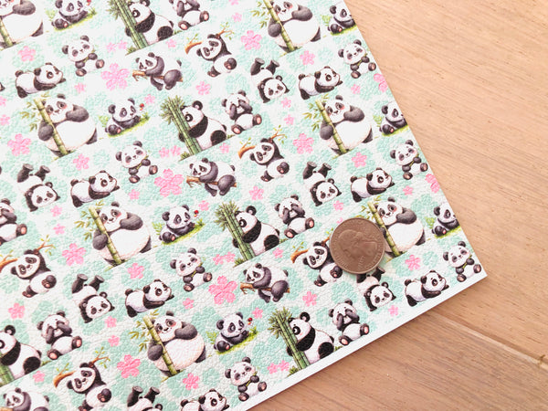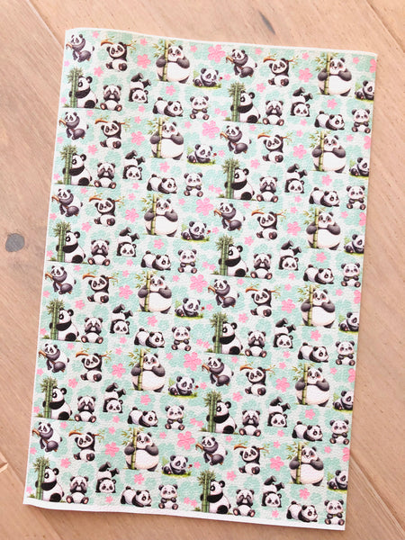 Printed pebbled faux leather with a panda bear design.